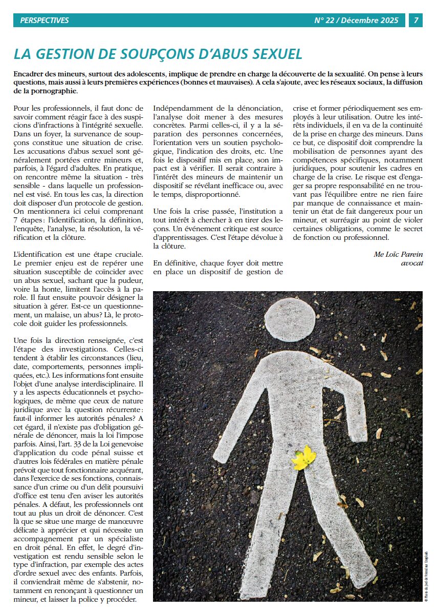 Me Loïc Parein a publié un article dans le n° 22 de la revue Perspectives (décembre 2025), le périodique de la Commission latine d’éducation sociale (CLES), sur la gestion des soupçons d’abus sexuel dans une institution.